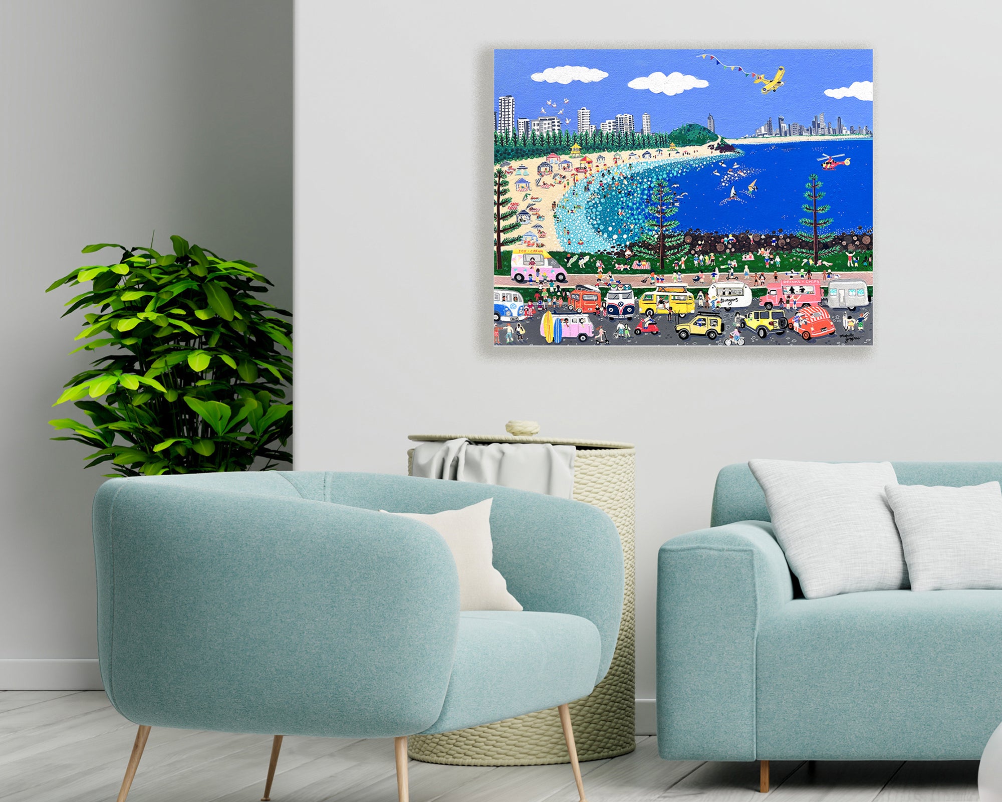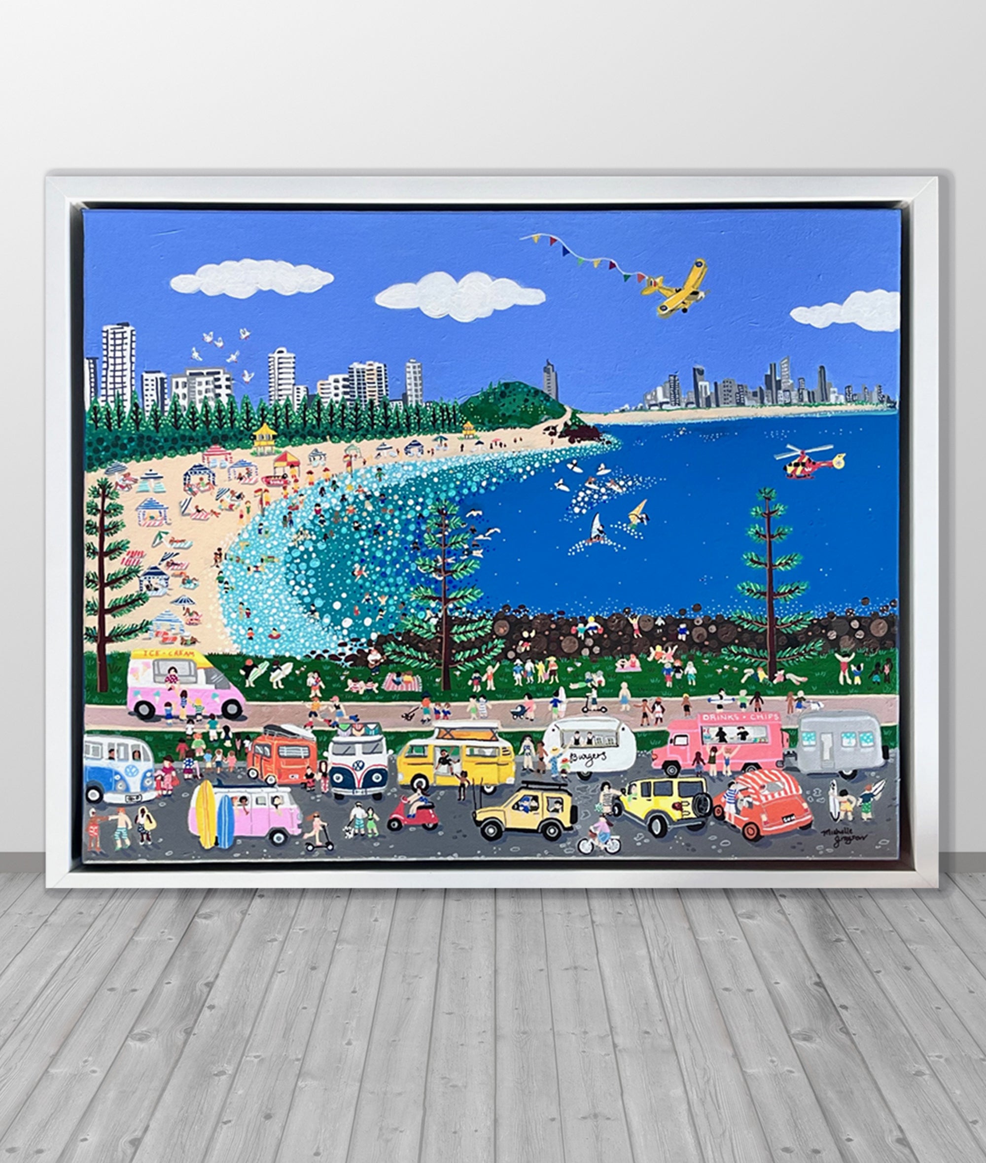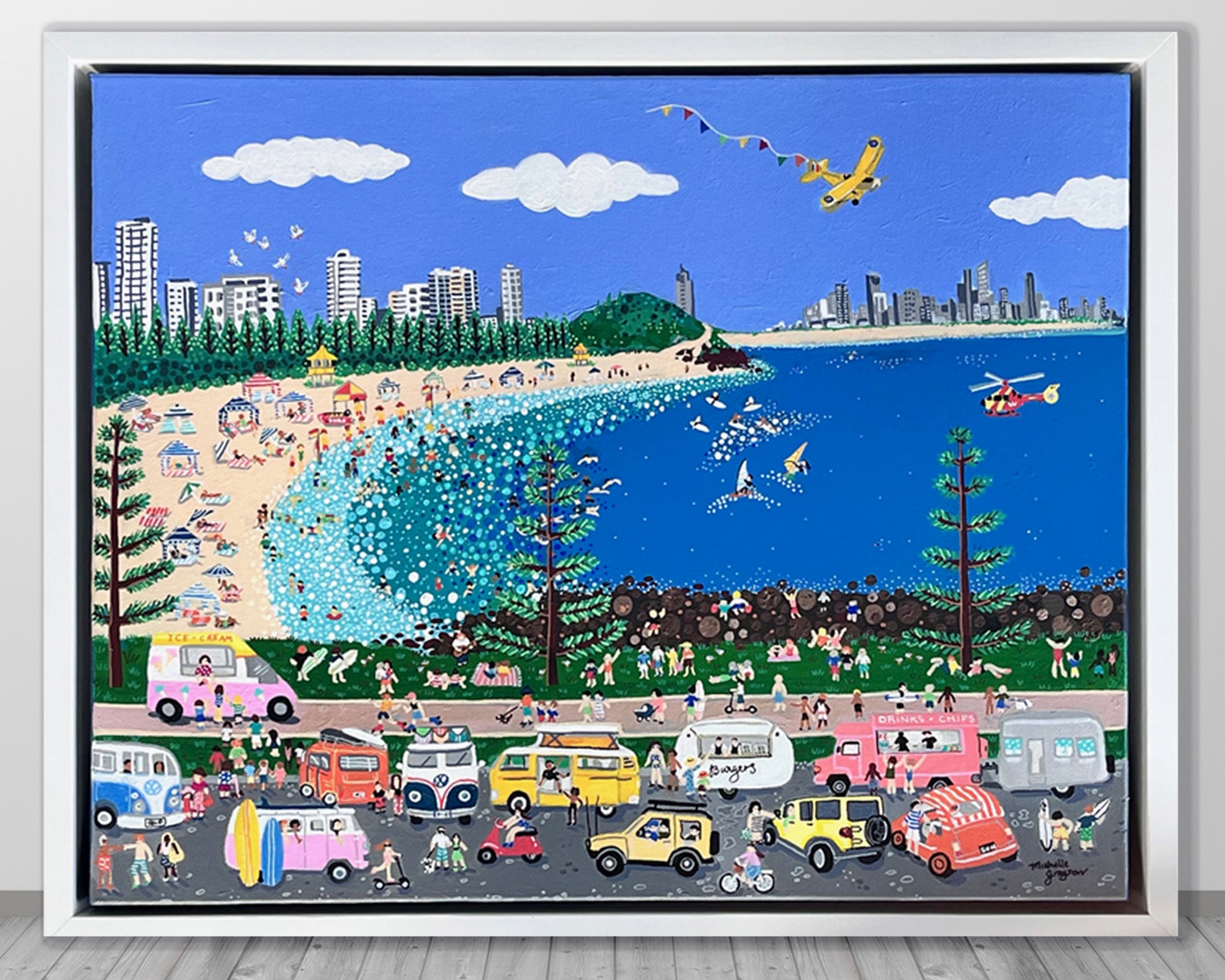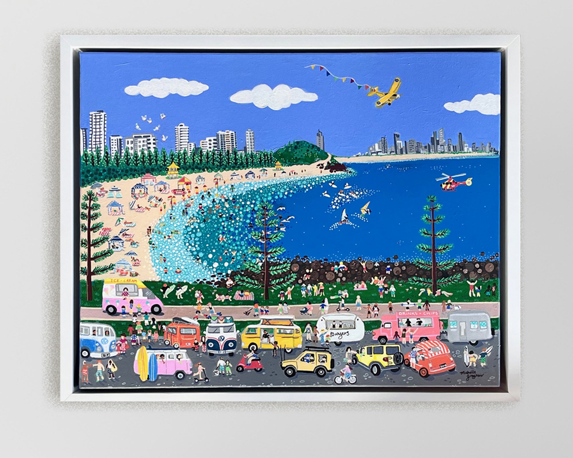 The beach has always been my happy place, and I love capturing its iconic charm in playful, vibrant scenes that celebrate our stunning coastline. If you know the Gold Coast, you’ll recognise Burleigh Heads, one of its most loved landmarks. My whimsical, naive style brings a touch of fun and nostalgia to this detailed piece, reflecting the sunshine-filled magic of life at the Goldie.