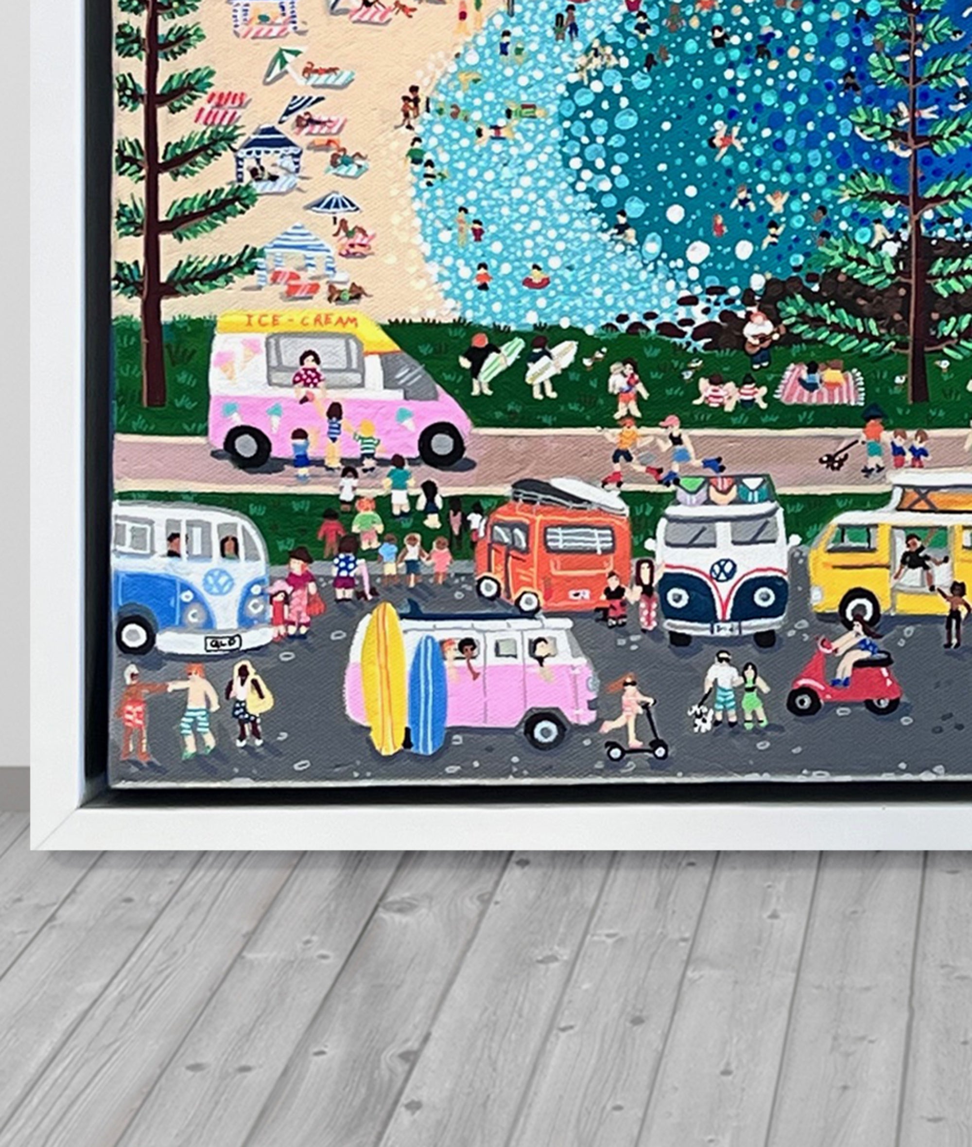 I LOVE BURLEIGH is the perfect artwork for all those have shared wonderful holidays at this fabulous iconic part of the Gold Coast. Mr Whippy, kombi vans - new and old - surf dudes, families, backpackers, surf umbrellas, surf ski's, aeroplanes, the jets overhead, the frolicking in the sand. The fun is endless and I love that it is depicted in this piece of artwork very special to me.